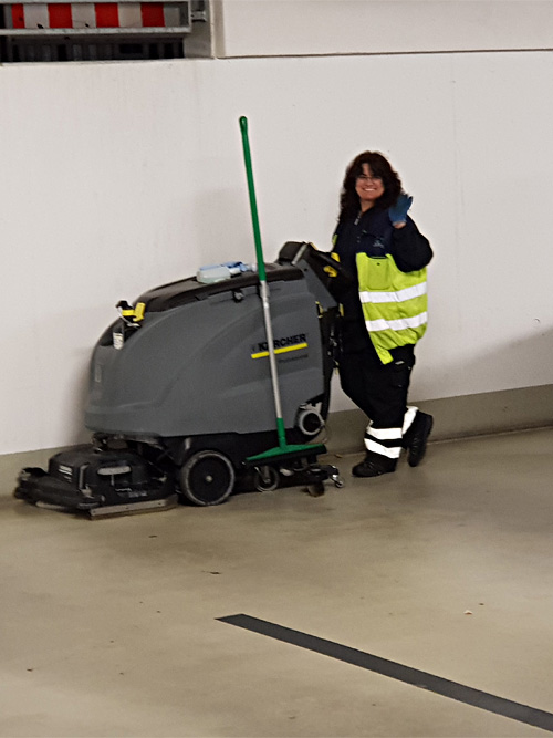 Für die Reinigung von Tiefgaragen und Parkhäusern verwenden wir Aufsitzmaschinen und handgeführte Maschinen – in erster Linie zum Kehren und Nassreinigen. In einer Grundreinigung wird der Boden intensiv entstaubt, wobei der Staub mit Sprühnebel gebunden wird. Wir können alle Arten von Böden nass reinigen und setzen dazu Schrubb-Saugmaschinen ein.